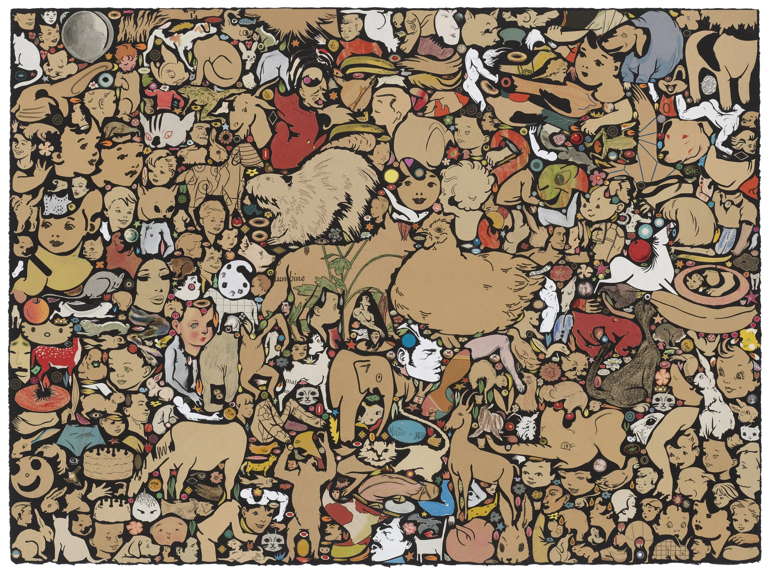 Peace, 2019, hand-cut and pasted vintage printed paper on found vintage lithograph, 11 3/8 x 13 1/8 inches