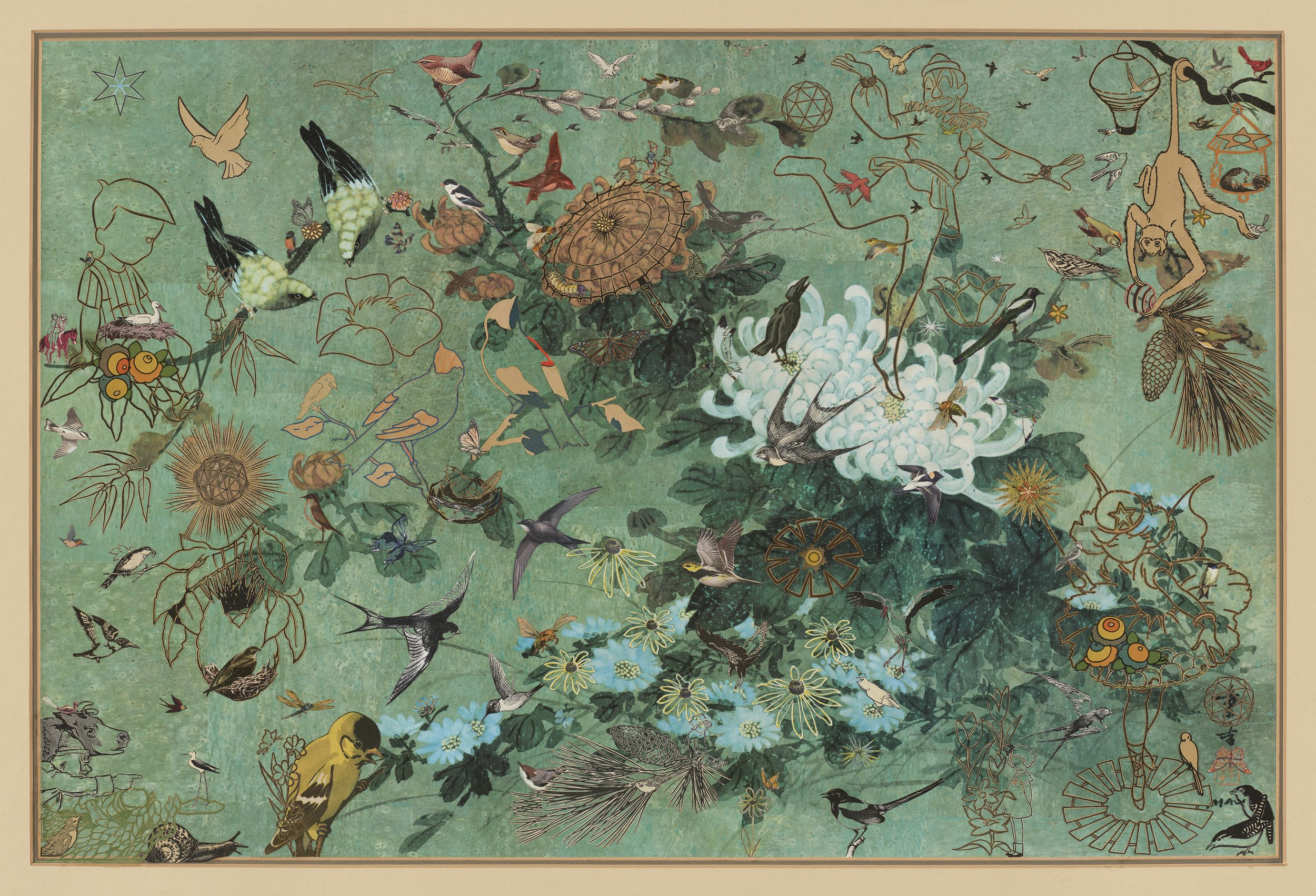 Bird Haven, 2025, hand-cut and pasted vintage printed paper on found vintage lithograph 25.5 x 35.5 inches SOLD